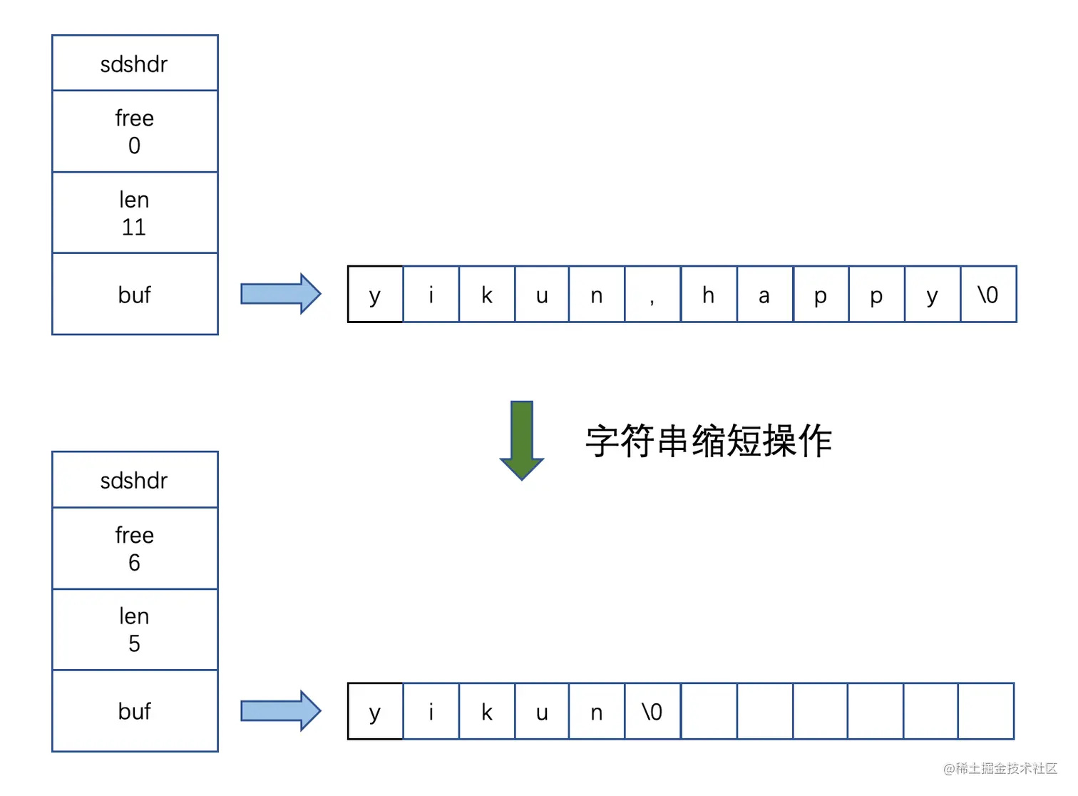 缩短操作也是同理,删掉N个字符后,我free就增加N,我先不做内存重分配操作,就先给你留着呗,万一你后面又做拼接是不是。