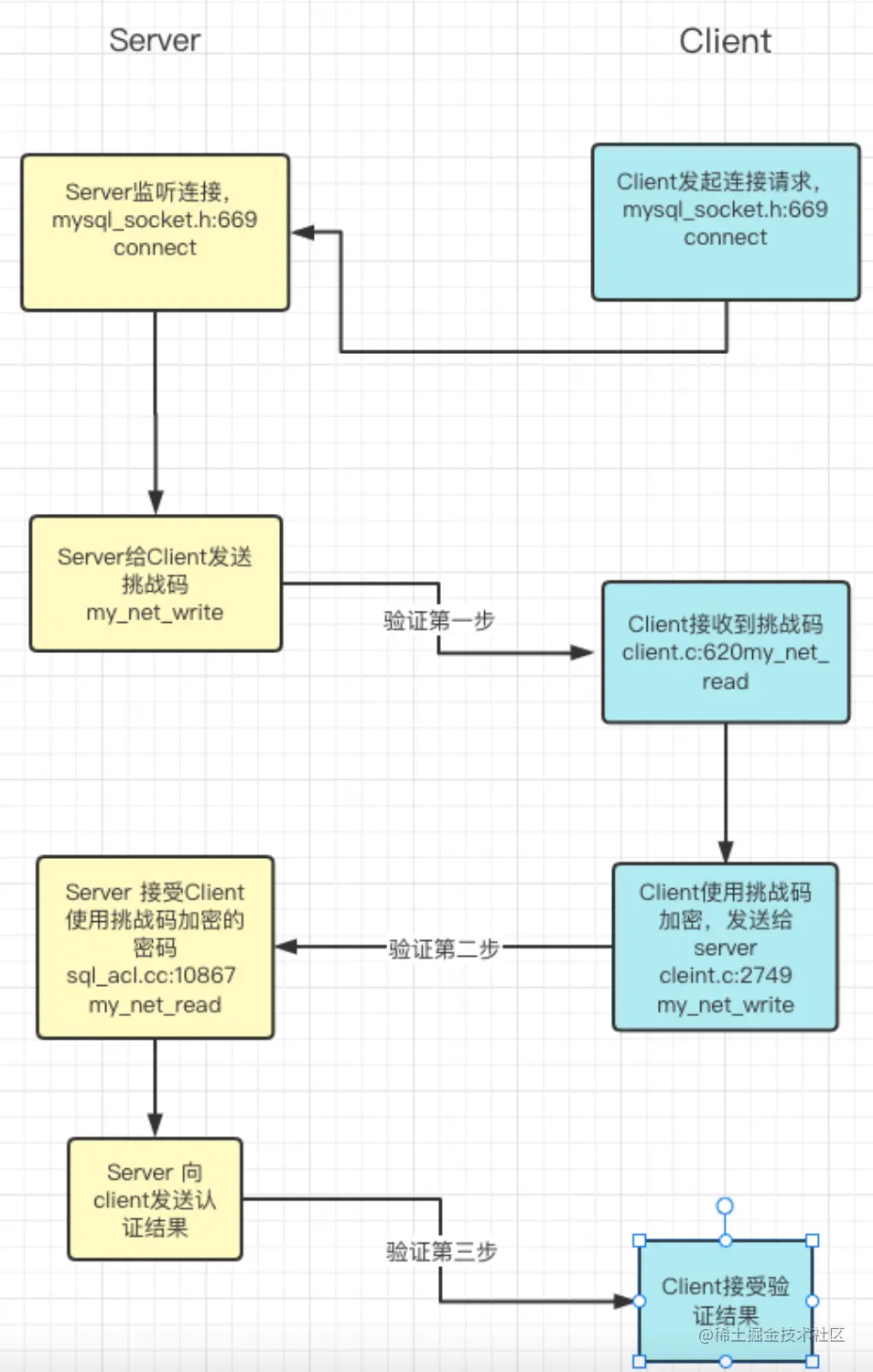 Mysql的认证链接可以看作是三次交互,注意第一次请求是服务端发起的,有点类似我们去店里面买东西,首先开口的肯定是员工,比如问我们要什么东西,于是我们花钱买东西,然后把东西带走,认证过程可以类似于这样的一个过程。