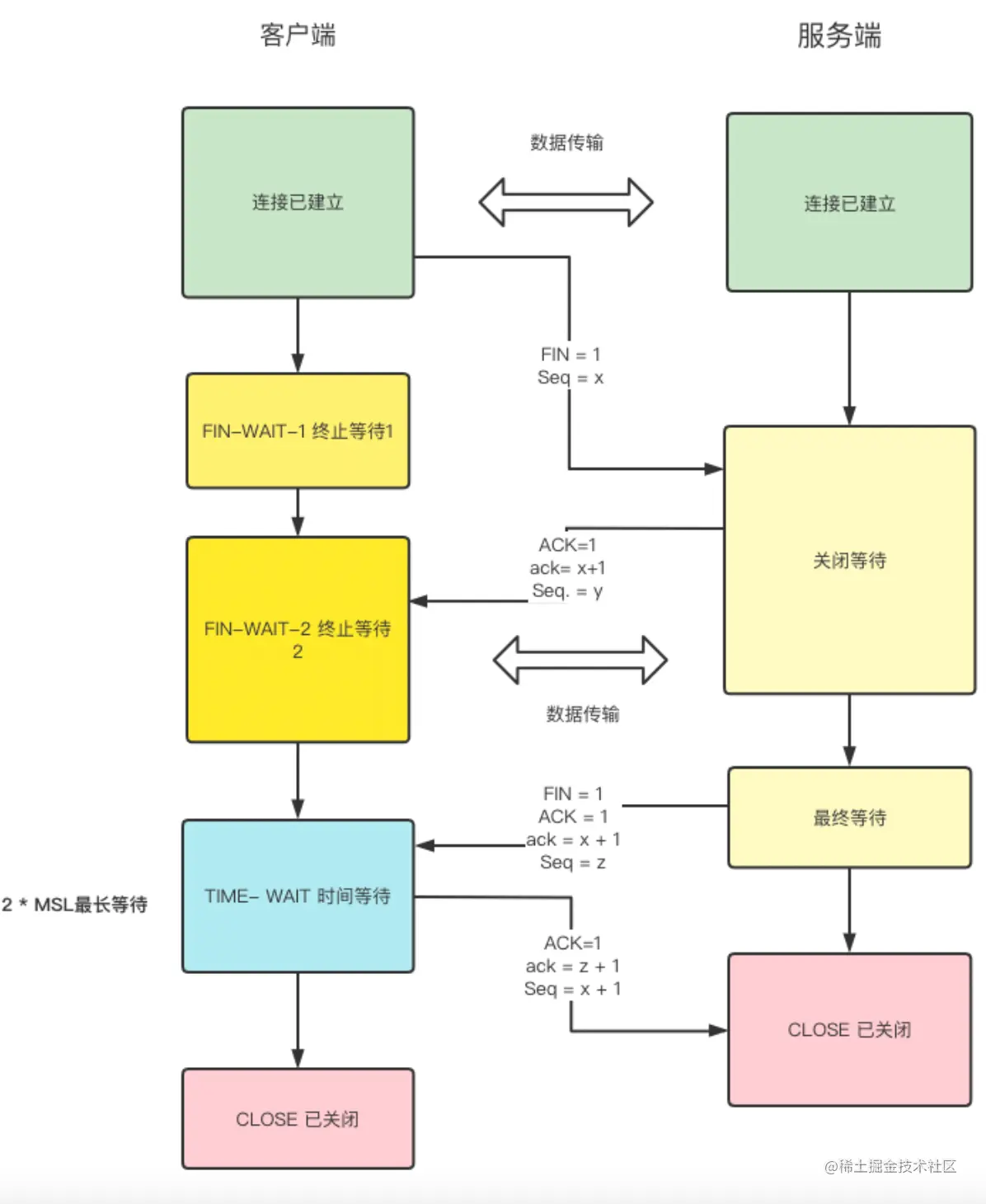 - 第五步(客户端):客户端收到报文之后,发出确认 ACK=1,ack=w+1,自己的序列号为Seq = t + 1,此时客户端进入到了TIME-WAIT(时间等待状态),此时客户端还是没有释放,必须经过**2 * MSL(最长报文寿命)**之后,客户端撤掉TCB之后才进入CLOSED状态。