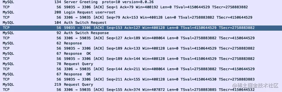 命令是如何执行的?可以使用一些辅助的抓包工具查看,比如windows平台有一个wireShark的工具,我们可以通过一个简单的抓包案例查看: 在实际的开始之前我们需要弄清楚Mysql到底使用的是什么协议,MySQL客户端使用TCP协议作为底层传输协议,而使用Mysql公司自身的Mysql Protocol协议作为应用层协议作为内部通信。
