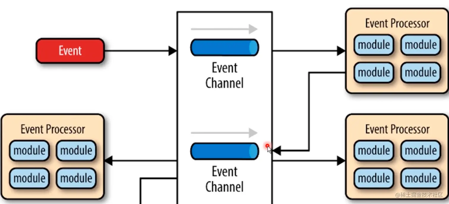 事件驱动的模式常见于GUI的软件当中,我们点击某个按钮的时候,会触发与之关联的其他事件组,从下面的架构图可以看到事件和事件执行之间是结偶的,有很好的复用性。