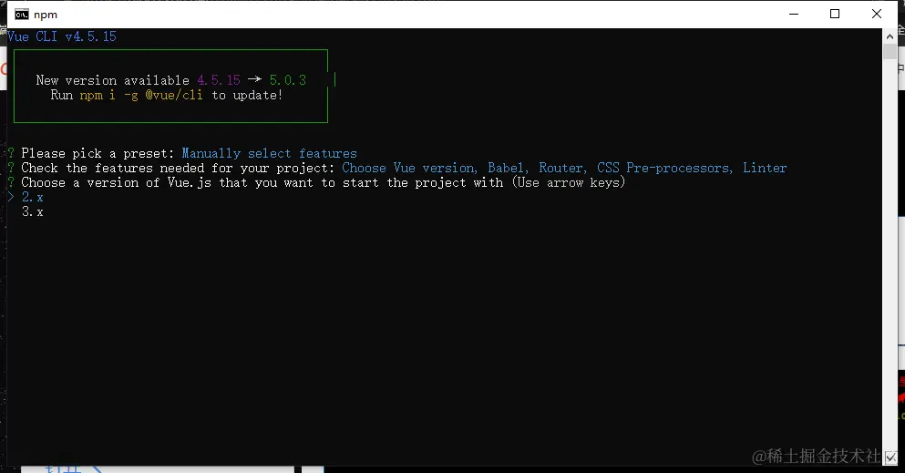 注意: 1、Vue CLI工具在v2版本从npm下载是使用 npm i -g vue-cli,从v3版本开始vue-cli就会变成 @vue/cli 2、Vue CLI在版本v4.5之后可以除了创建Vue2的项目,还可以创建Vue3.0的项目。