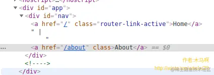 非域名根目录下部署,首先肯定要配置publicPath。需要注意的点前面其实已经提过了,就是这种情况下不能使用相对路径./或者空串配置publicPath。为什么呢?原因是它会导致router-link等的表现错乱,使用测试项目[2]分别使用两种配置打包发布,审查元素就能看出区别。在页面上有两个router-link,Home和About: