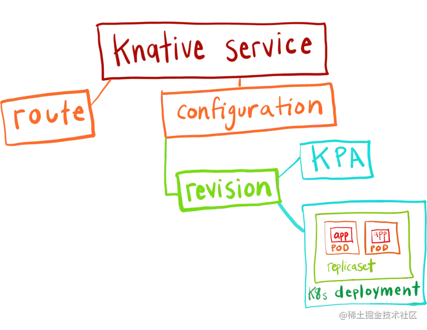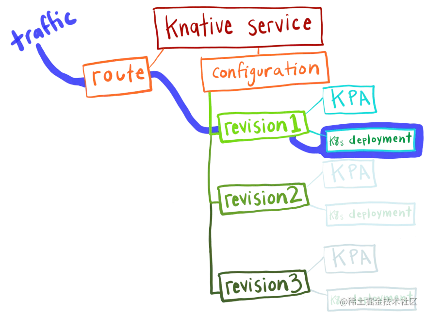 Knative Service 会自动为您的 Service 创建配置和路由。 配置管理修订流,每个修订都与 Kubernetes 部署和 Knative Pod Autoscaler (KPA) 相关联。