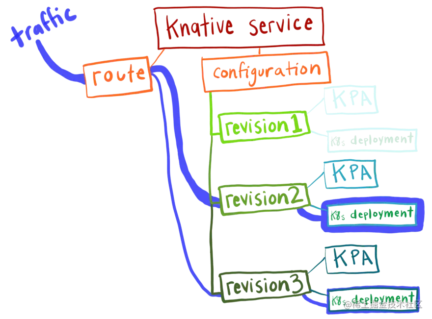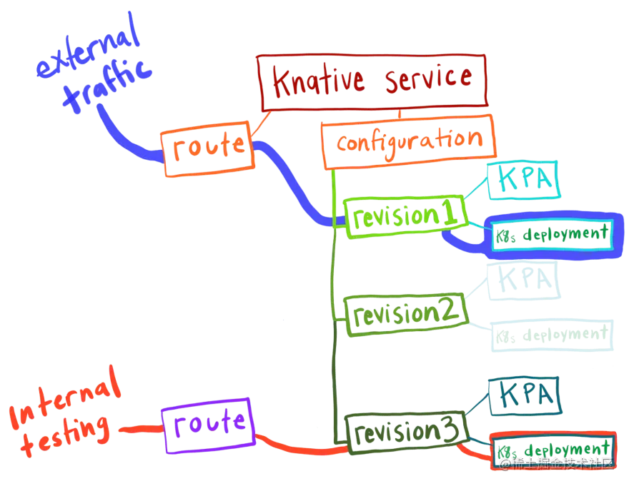 流量通过 Knative Route 进入集群。 默认情况下,路由将 100% 的流量发送到最新版本,但这是可配置的,我们将在本文后面讨论。