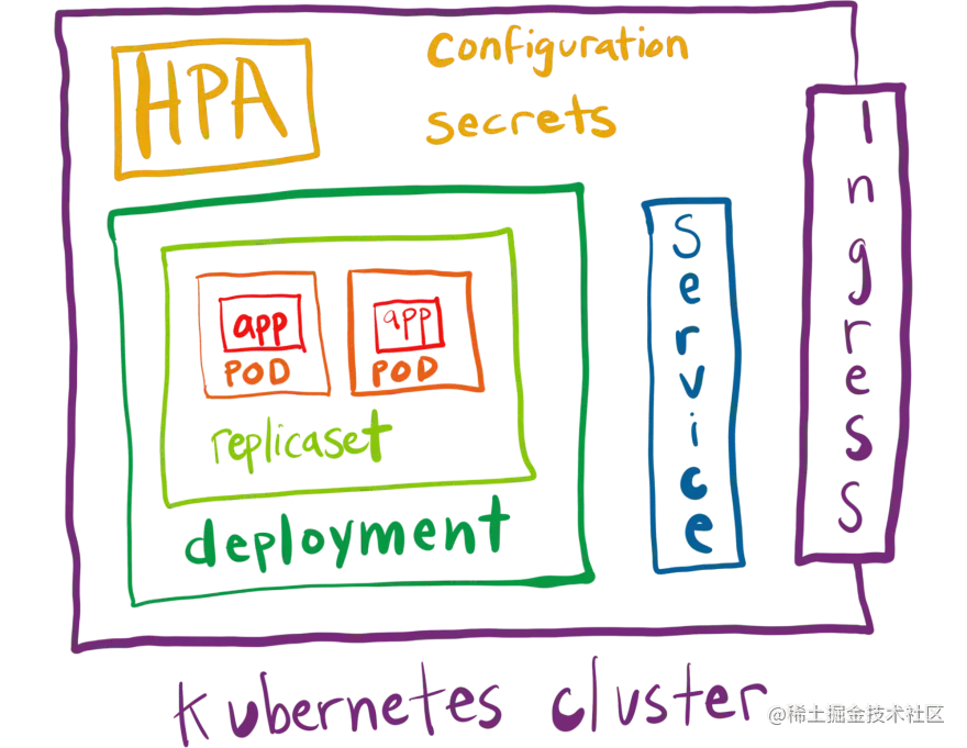 但是,您还需要创建一个服务,在集群内部公开您的应用程序(以便应用程序的其他部分可以访问它),并创建一个入口,使您的应用程序在集群之外可用(以便最终用户可以访问它)。如果你想要自动伸缩,你需要制作一个HorizontalPodAutoscaler (HPA)。您还需要将配置和机密信息与应用程序分开管理。