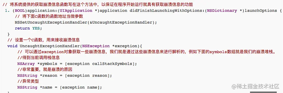 在程序启动时加上一个异常捕获监听,用来处理程序崩溃时的回调动作NSSetUncaughtExceptionHandler (&UncaughtExceptionHandler)。UncaughtExceptionHandler是一个函数指针,该函数需要我们实现,可以取自己想要的名字。当程序发生异常崩溃时,该函数会得到调用,这跟C,C++中的回调函数的概念是一样的。