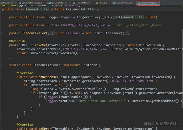 这个Filter类中有一个invoke()方法,和一个Listener的内部实现类。invoker方法只是做了下 invoker的简单调用,而Listener内的onResponse()方法则有较多的处理逻辑,会判断下接口执行是否超时。