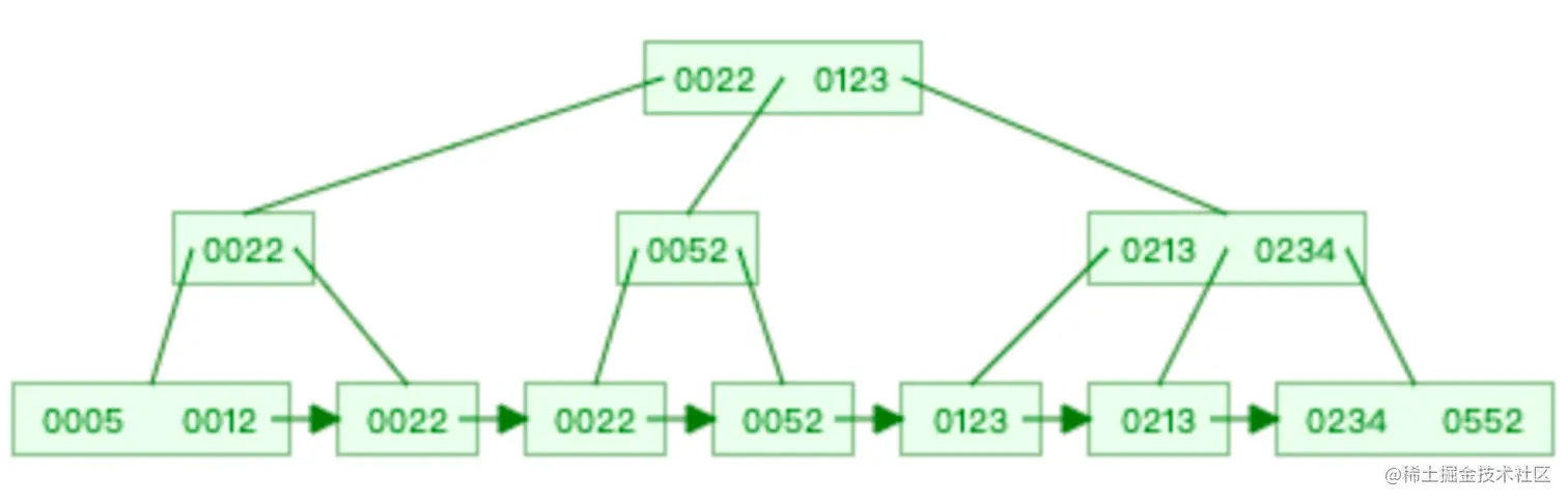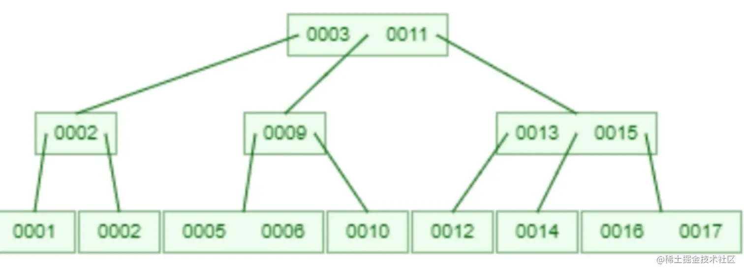 既然二叉树只有两个节点,那么我们调整结构,让每一层的节点内容增多,并让树控制在2-4层。同时可以包含多个子节点,这样即可极大提高存储效率,同时这种紧凑的结构也方便磁盘的顺序扫描。