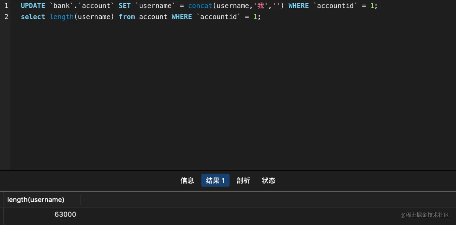 备注:length函数不是记录字符的个数,而是实际占用的长度,由于中文需要3个字符长度存储,所以实际存储的长度为63000/3=21000