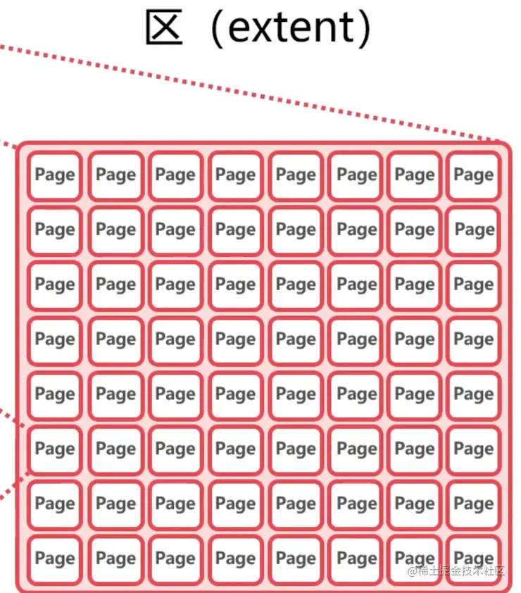 区:区通常由64个页组成,每一个段里面对应很多区,一个区段大小是1M,一般由连续段数据页组成,但是一般一次申请为申请3-4个。(需要考虑内存的承受能力)