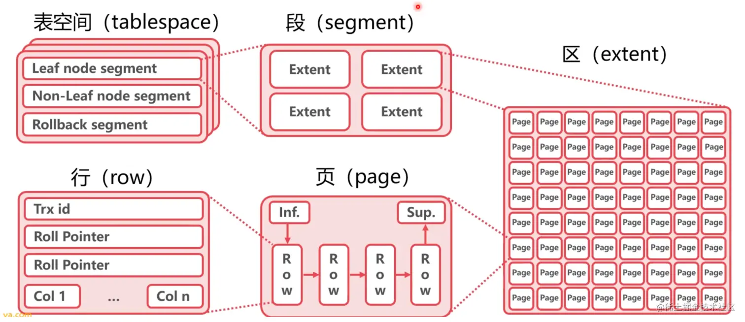 下面为InnoDb存储引擎的数据存储简易结构图,更加详细的结构在视频中并没有展开,另外如果展开讲述的话一篇文章也是远远不够的,所以这里只能是大致了解: