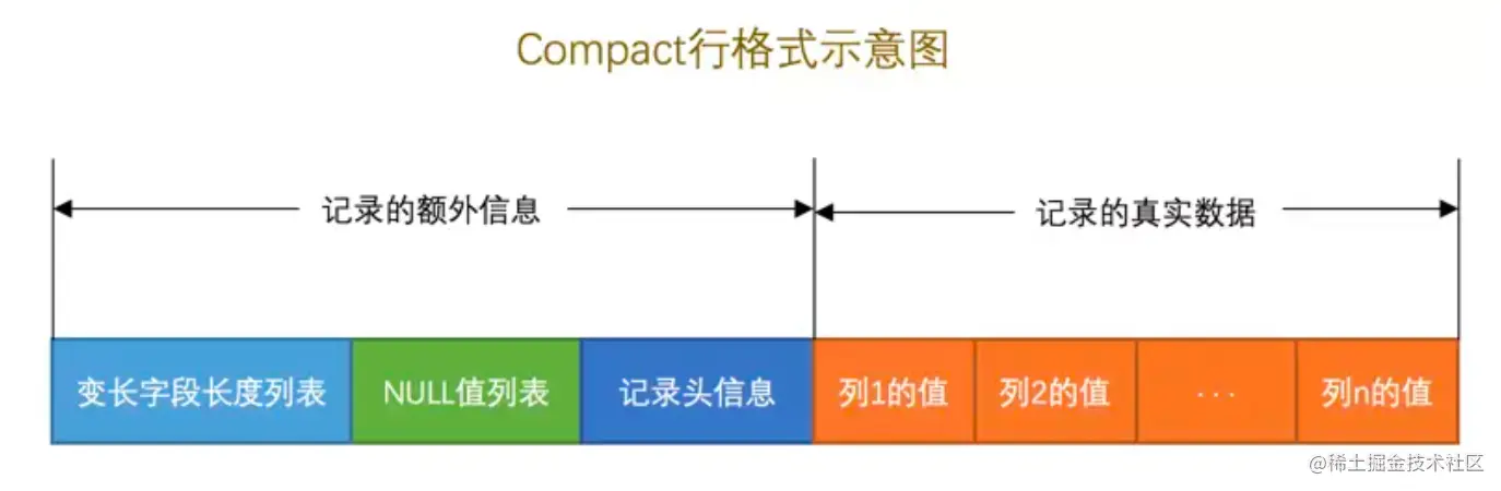 COMPACT格式:这个格式比REDUNDANT精致很多,可以看到上面的字段偏移列表不是很直观,每次都需要进行一次减法才能算出列的真实长度,所以Compact使用了变长字段列表改进,变长字段列表直接存储列的长度并且以逆序的方式存储,并且在此基础上加入了NULL值列表来维护每一列是否为NULL,使用位表的方式标志每一列是否为NULL,0为NULL,1为非NULL,并且同样是逆序存储。