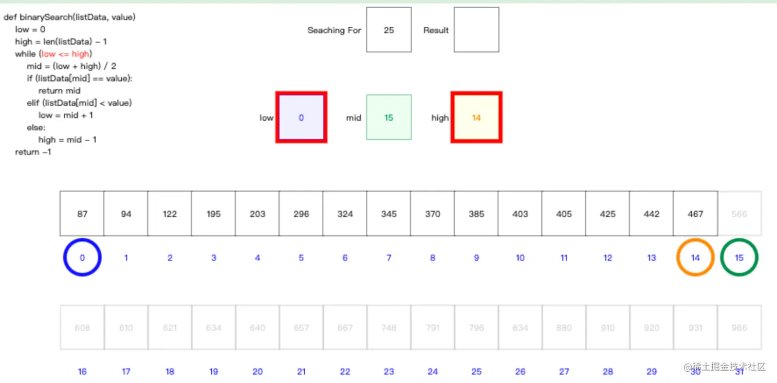 二分查找演示图:www.cs.usfca.edu/~galles/vis…