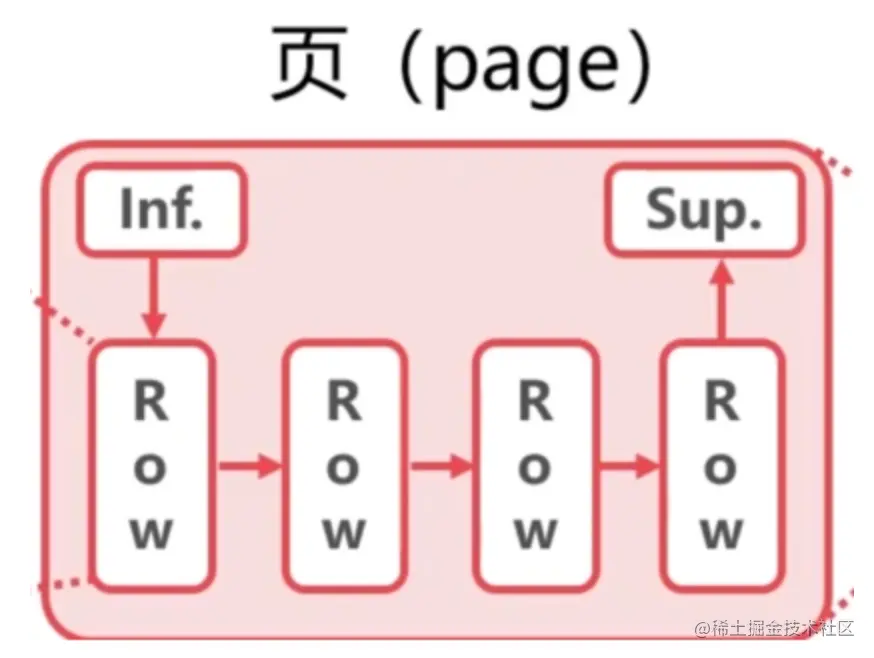 - 每一个数据页包含infimum数据行代表当前数据页的第一个节点也就是最小值,supermum代表最后一个节点也就是最大值,这两个“行记录”是Mysql设计者的一个小把戏,目的是方便数据的查找和不同数据页之间的串联,也就是说每一个数据页默认至少有两个“虚拟”数据行。