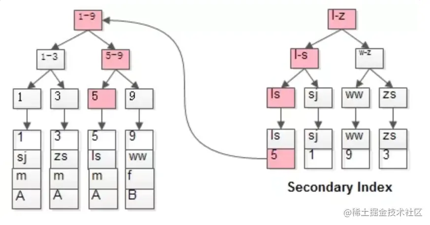 假设我们需要搜索值为5的数据,首先会在二级索引通过二分遍历“槽”的形式找到具体所在的数据行,这个数据行保存索引值之外还存储了主键的值,所以这里需要拿到主键的值回到聚簇索引中找到实际存储的行记录。