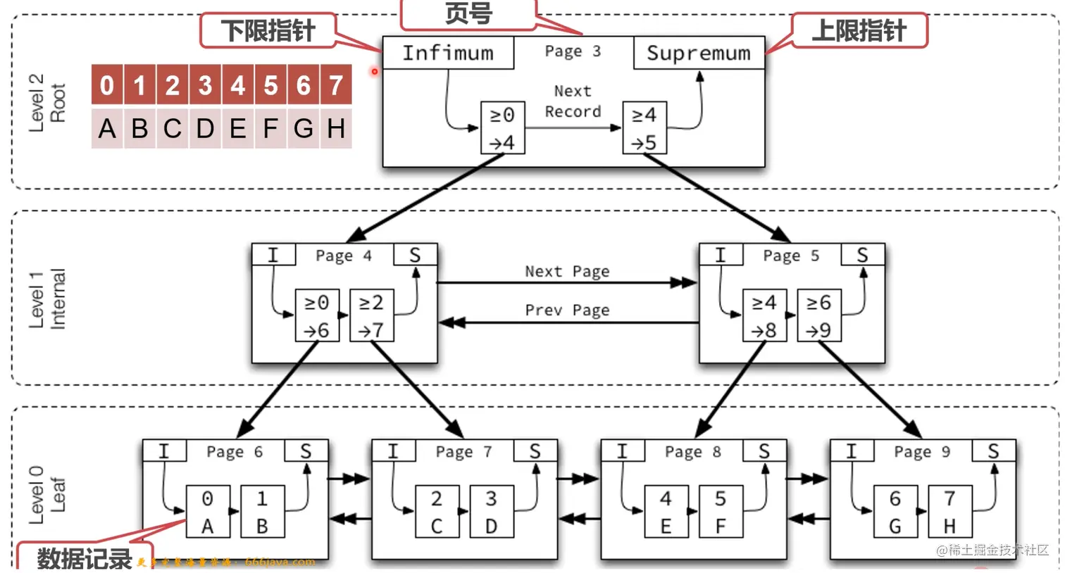 - 索引页之间使用链表进行连接,而叶子节点实际的数据存储区域,统一使用链条表进行串联。所以可以发现除开最顶层,所有的层级页和页之间是由链表之间链接的。