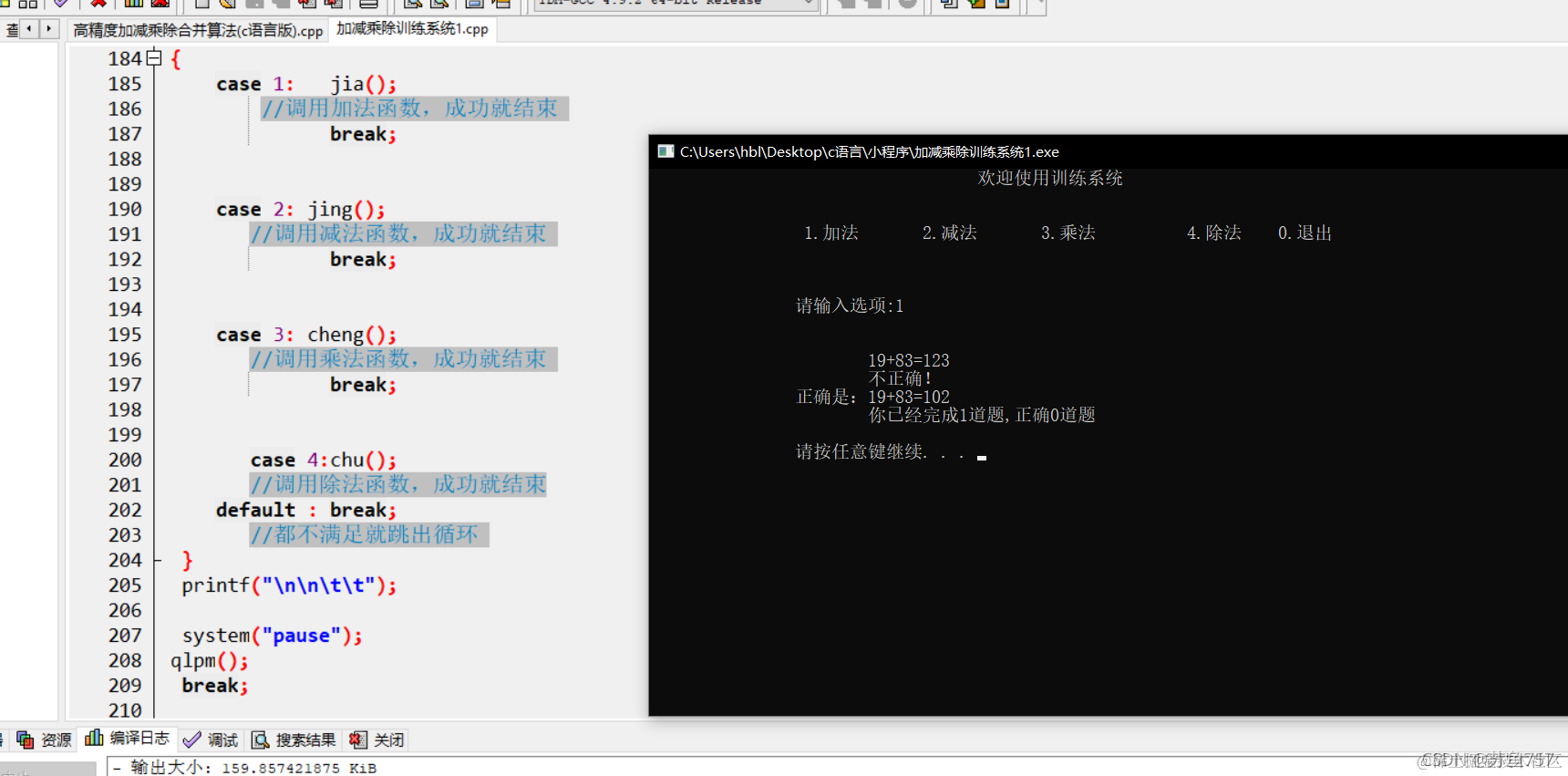 printf("\n\t\t\t你已经完成%d道题,正确%d道题",w_c,z_q);