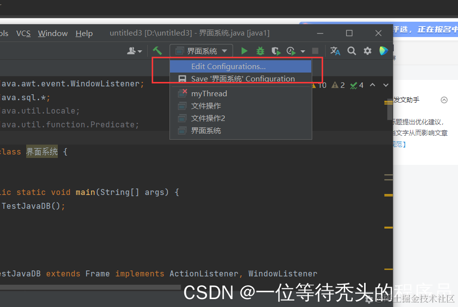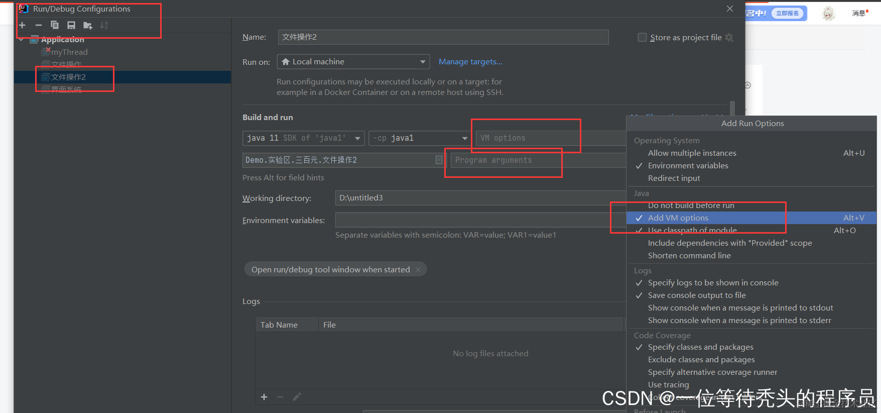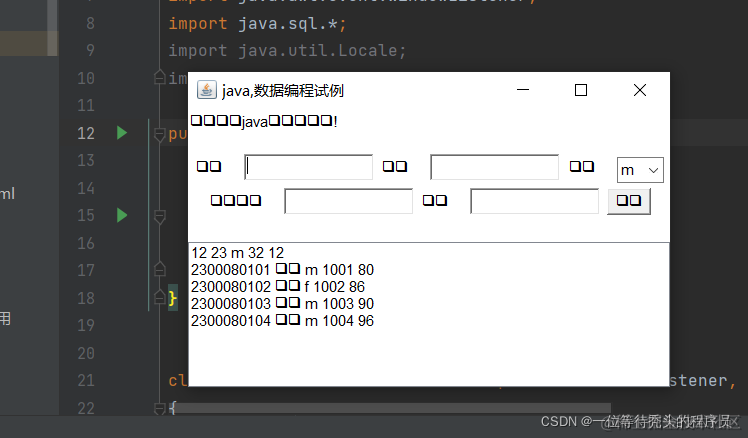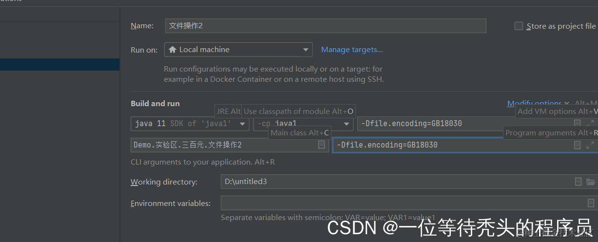 java图像中文显示为乱码解决方法 一位等待秃头的程序员 2022-03-19 133 阅读1分钟 出现这个情况: 点击此位置 如果有 VM optis 这个就点击add这个就有了 2个都添就加 -Dfile.encoding=GB18030 这句话 就完成了就不会出现乱码了 就完成了!