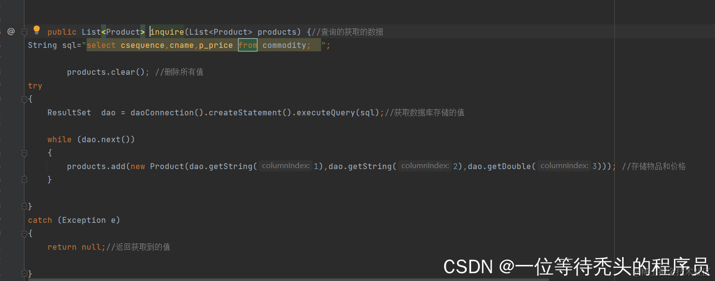 products.add(new Product(dao.getString(1),dao.getString(2),dao.getDouble(3))); //存储物品和价格