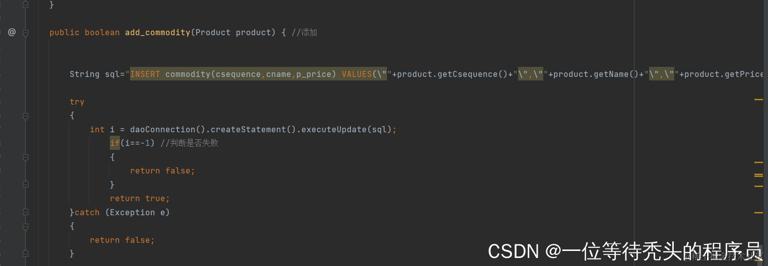 String sql="INSERT commodity(csequence,cname,p_price) VALUES(\""+product.getCsequence()+"\",\""+product.getName()+"\",\""+product.getPrice()+"\")";