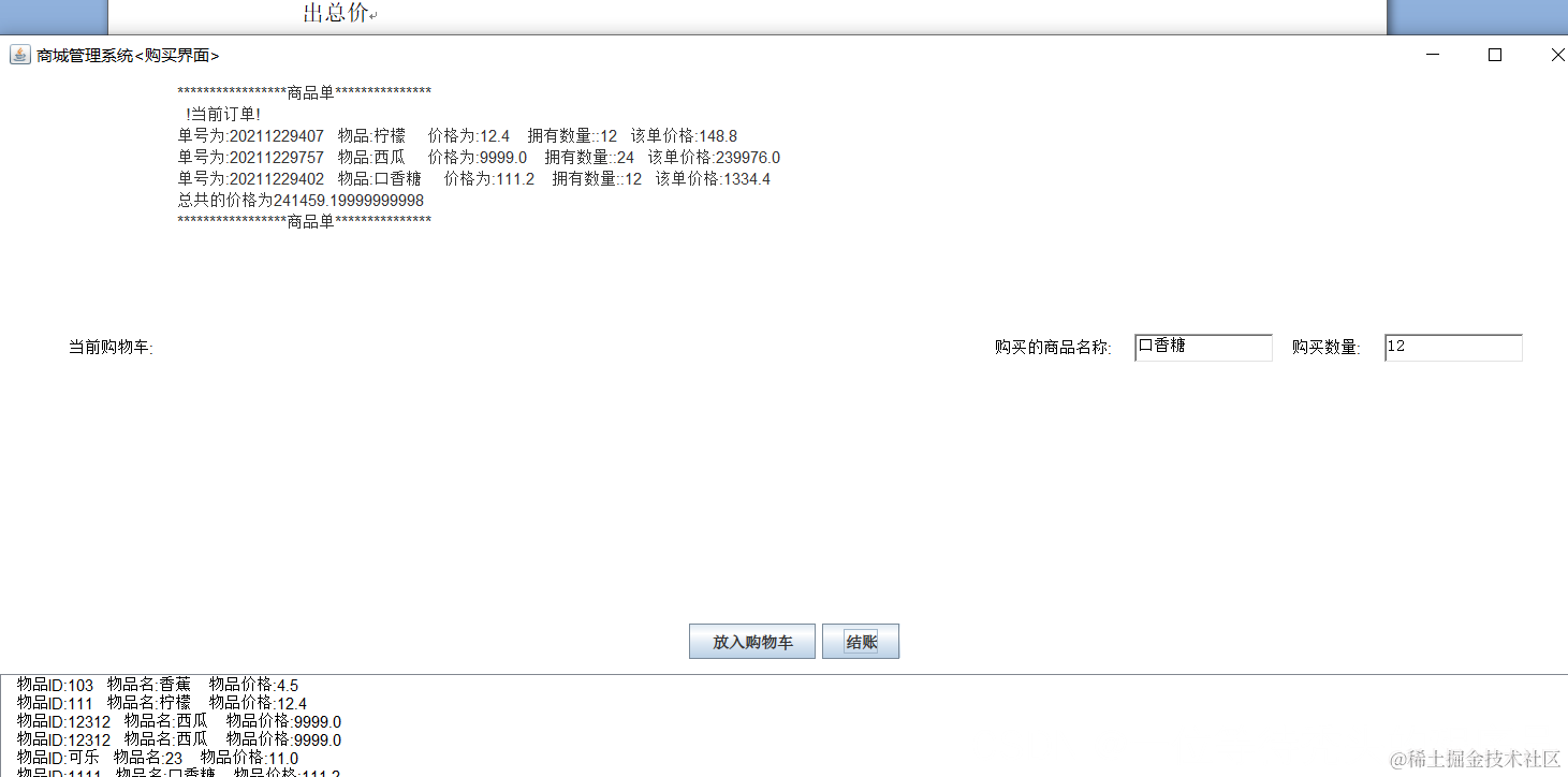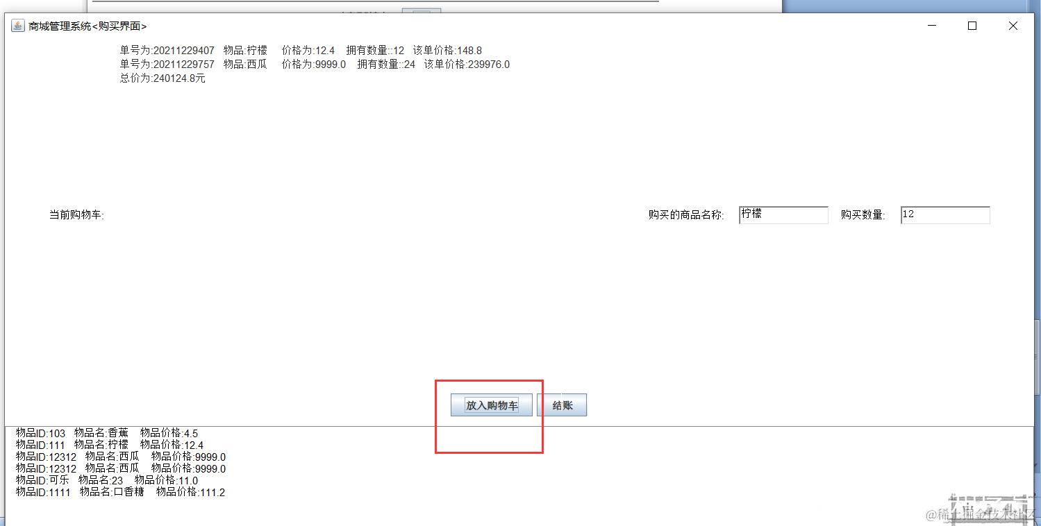 输入对应的商品名称以及数量,点击放入购物车,就会在商品界面添加一条记录,以及自动算出总价