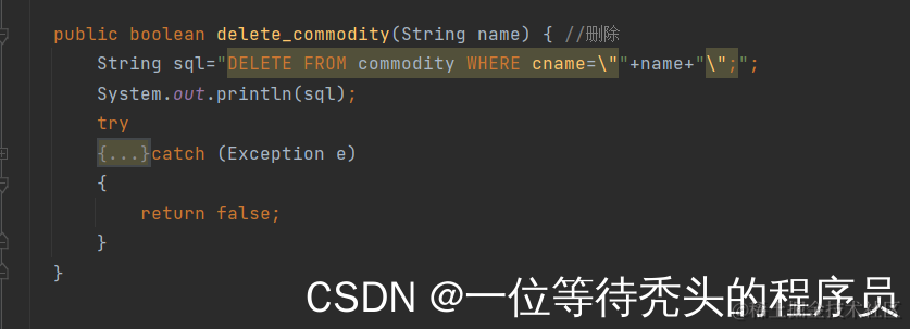 String sql="DELETE FROM commodity WHERE cname=\""+name+"\";";