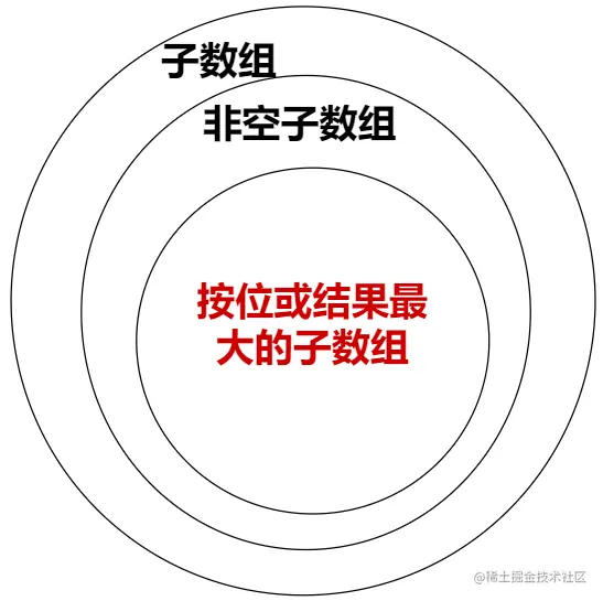 我们可以看到,做这个题,其实我们就是要明确有这样的包含关系,我们需要的是最里面的的按位或结果最大的子数组