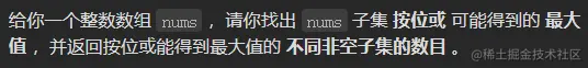 这个时候,我可以按照子数组中 bit 为 1 的位置对应数组中的数字,作为一个集合,总共 2 的 n 次方 -1 个集合,每个集合计算按位或的结果,最终筛选出按位或最大的值的子数组个数即可