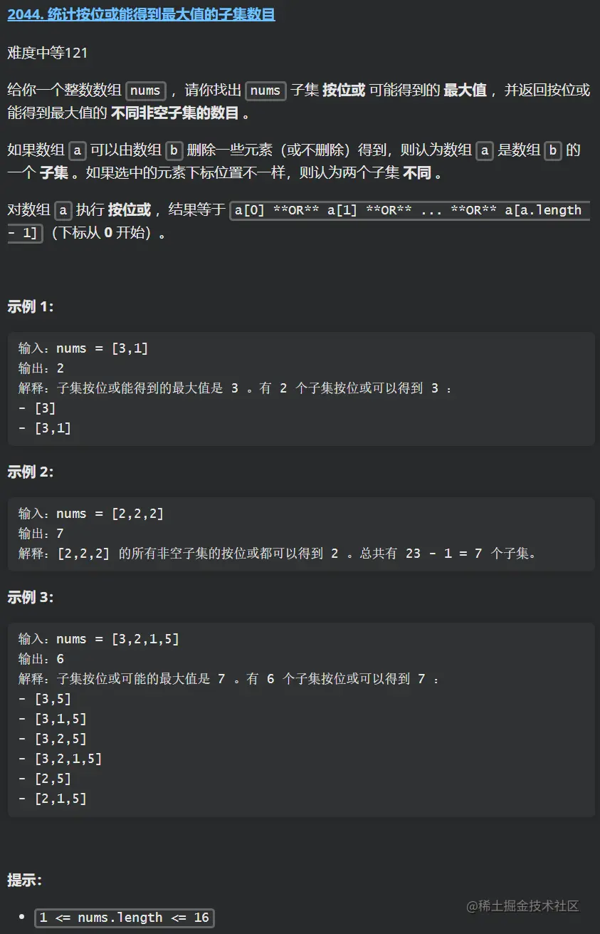 本次刷题日记的第 8 篇,力扣题为:2044. 统计按位或能得到最大值的子集数目 ,中等