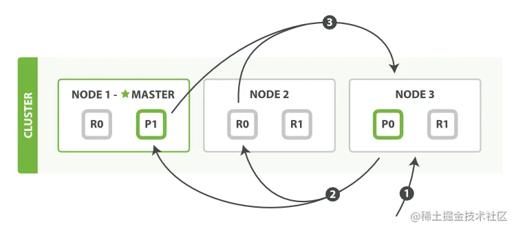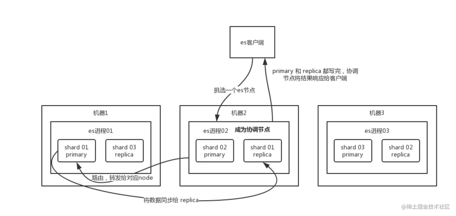 coordinate node。 coordinate node对doc id进行哈希路由,将请求转发到对应的 node,此时会使用round-robin随机轮询算法,在primary shard以及其所有 replica 中随机选择一个,让读请求负载均衡。- 接收请求的 node 返回 document 给