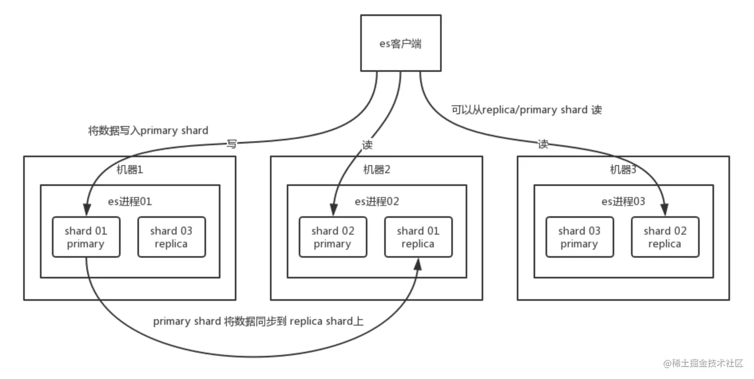 写请求是写入 primary shard,然后同步给所有的 replica shard;读请求可以从 primary shard 或 replica shard 读取,采用的是随机轮询算法。