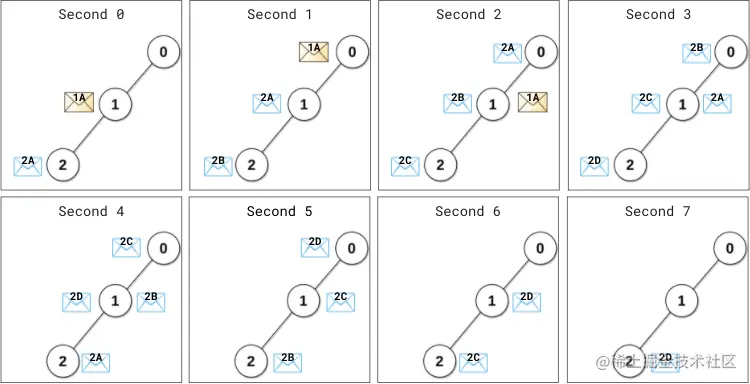 - 数据服务器 2 还没收到任何回复。距离上次发出信息过去了 1 秒(1 == patience[2] = 1),所以它重发一条信息(用 2B 表示)。