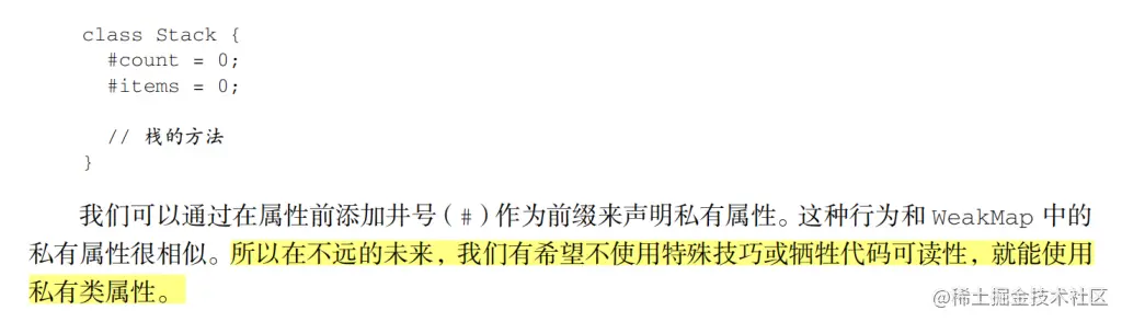 ES6中的类是基于原型的,尽管基于原型 的类能节省内存空间并在扩展方面优于基于函数的类,但这种方式不能声明私有属性(变量)或 方法。另外,我们希望 Stack 类的用户只能访问我们在类中暴露的方法。下面来看 看其他使用 JavaScript 来实现私有属性的方法 。