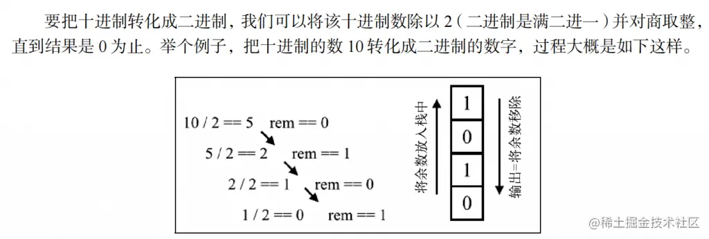 栈的应用很多,这里以一个简单的例子说明:如何将10进制数转换成2进制的2数。
