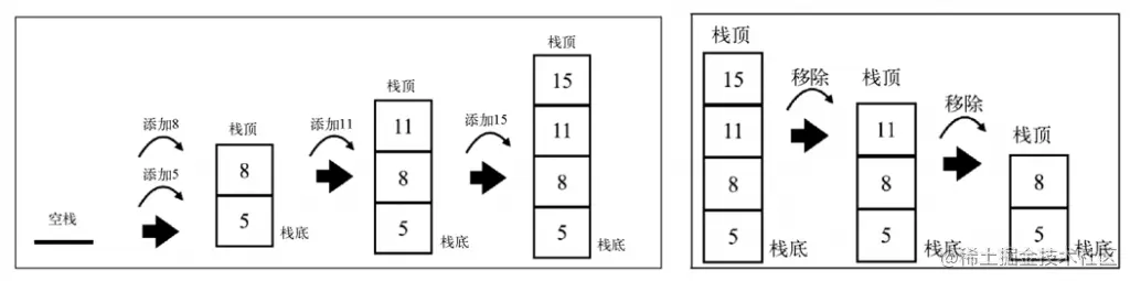 现在栈内元素为:5,8,11,15 最后加入的15在栈顶
