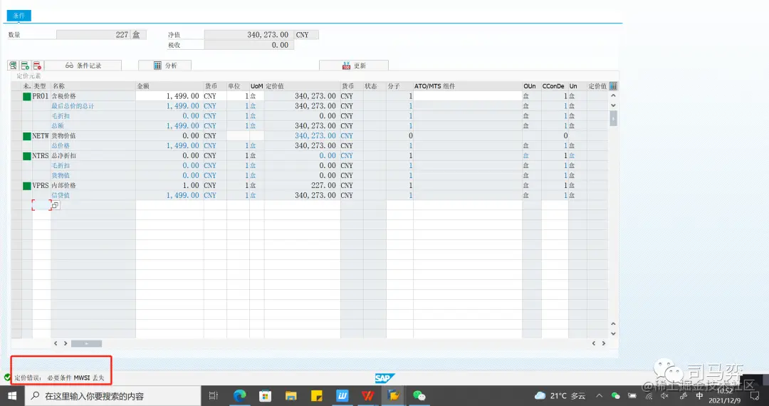 SD销售订单报错提示 定价错误:必要条件 MWSI 丢失