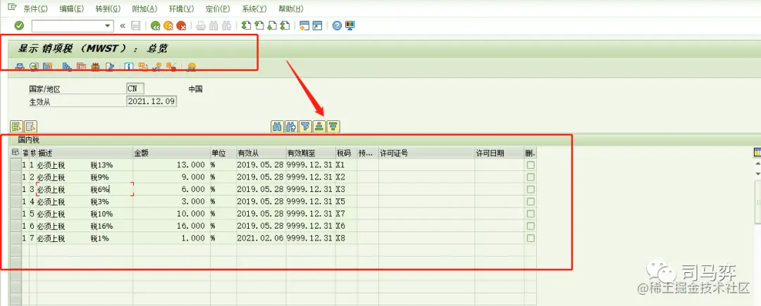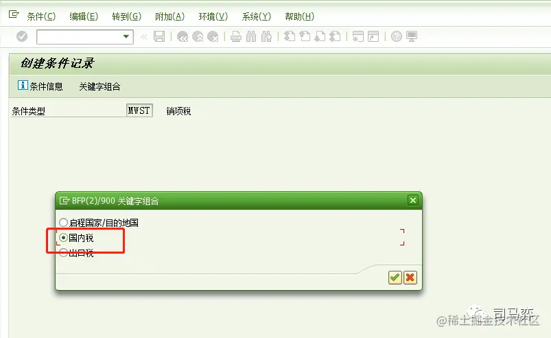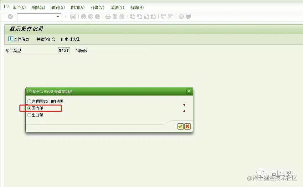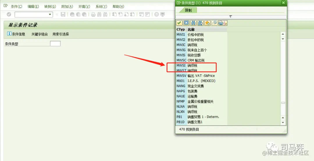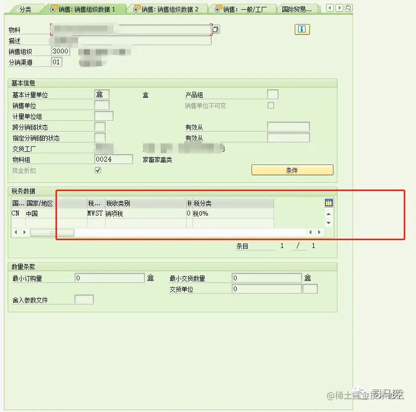 注意进去查看前的条件,物料主数据-销售视图1里的税收类别是什么,上一个截图有框出来,选的是【MWST-销项税】