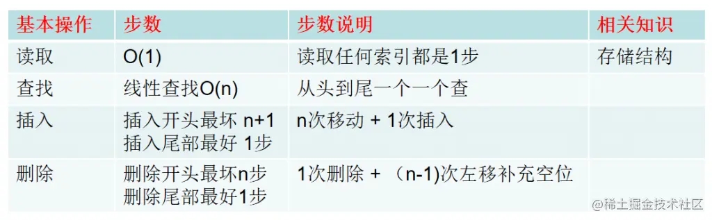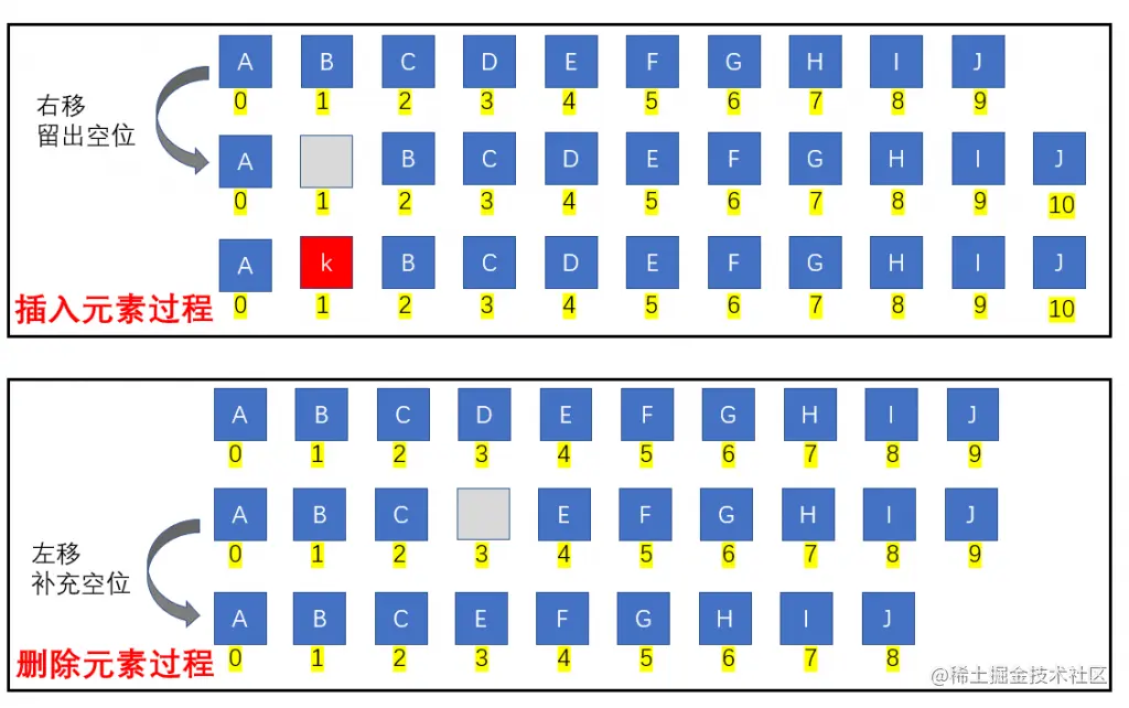 因为数组在内存中的格子必须是连续的,因此,数组中不能有空的元素,必须全部填满。这导致了数组在进行插入、删除的时候,虽然插入和删除本身只需要一步操作,但是插入[n]时,n右侧元素必须全部右移才能留出空位n;删除操作也是一样,删除[n]处的元素后会留一个空位,n右侧的必须全部左移才能填满。在插入和删除上,链表的优势就比较明显。