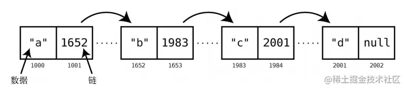 链表的每个节点需要两个格子,第一个用于保存数据,第二个保存着链表里的下一结点的内存地址