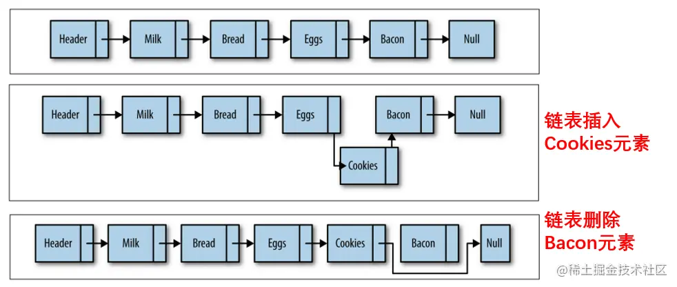可以看出来,链表在插入和删除过程中操作非常简单。插入只需要把一条链条断开,中间接入新元素的左右端即可;删除元素只需要把要删除的元素左右的链直接连起来,这样被删除元素就脱离链表了。不过要注意的是,链表的访问必须是从头开始,因此要插入cookies元素,必须先访问到eggs元素,而这个步骤是O(n)。这样似乎链表和数组的性能是差不多的,甚至数组还要更好?如下图分析。