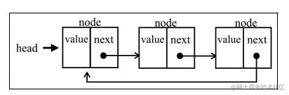 循环链表可以像链表一样只有单向引用,也可以像双向链表一样有双向引用。循环链表和链 表之间唯一的区别在于,最后一个元素指向下一个元素的指针(tail.next)不是引用 undefined,而是指向第一个元素(head),如下图所示: