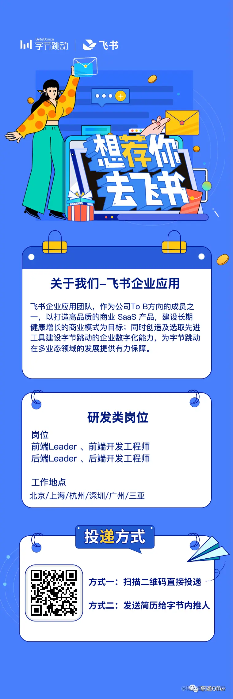 字节跳动飞书团队招聘!100+hc ! 真的缺人,研发都开始写软文招聘了! 可以冲! Light_内推 2022-03-20 1,006 阅读1分钟 【真的缺人】 字节飞书,真的缺人! 今年的目标是100多个HC 研发自己都开始写软文了。。。 拉上hr,给了一份急招岗位清单! 前端后端 ,社招,春招补录,暑期实习都有大量的hc。 感兴趣的可以冲了! 腾讯阿里伤心人,字节在等你 附上研发和hr的聊天记录 编辑切换为居中 添加图片注释,不超过 140 字(可选) \ \ \ 【关于飞书】 【校招岗位】 【校招内推码】 【社招、实习岗位】
