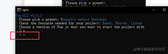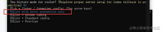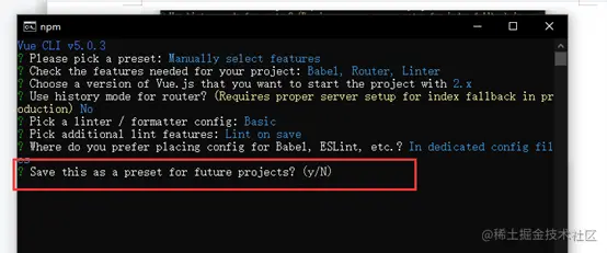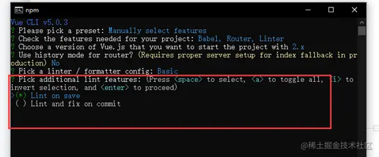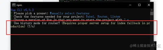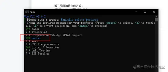 Vue router cmd终端命令安装步骤 小狼学习录 2022-03-20 248 阅读1分钟 打开文件夹 在路径栏里面输入cmd 打开cmd命令行 首先输入 vue create router-pro 选择下面选项 按下键选择路由并回车: 选择vue2版本 问你是否使用路由的历史模式: 输入n 问你eslint的语法规范选择哪种? 我们选择第一个最基本的格式校验 下面问你什么时候校验语法规范? 我们选择保存的时候校验选择第一个 问是否采用最基本的校验更新到package文件? 默认选择第一个回车 问你是否配置好了?输入y 还会跳出一个选项 你可以输入y 回车 也可以直接回车
