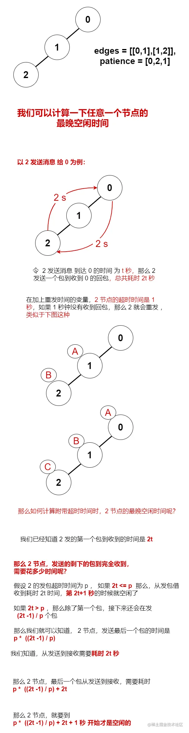 题目中还提供一个数组,来表示对应服务器发送信息出去后的超时重发时间,如果在指定时间内服务器收到了主服务器 0 的回包,那么就不重发,否则就重发
