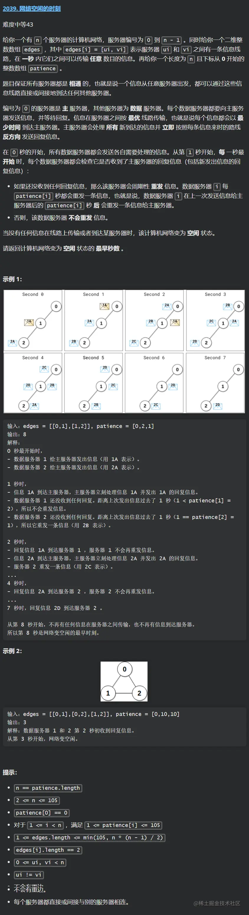 本次刷题日记的第 9 篇,力扣题为:2039. 网络空闲的时刻 ,中等