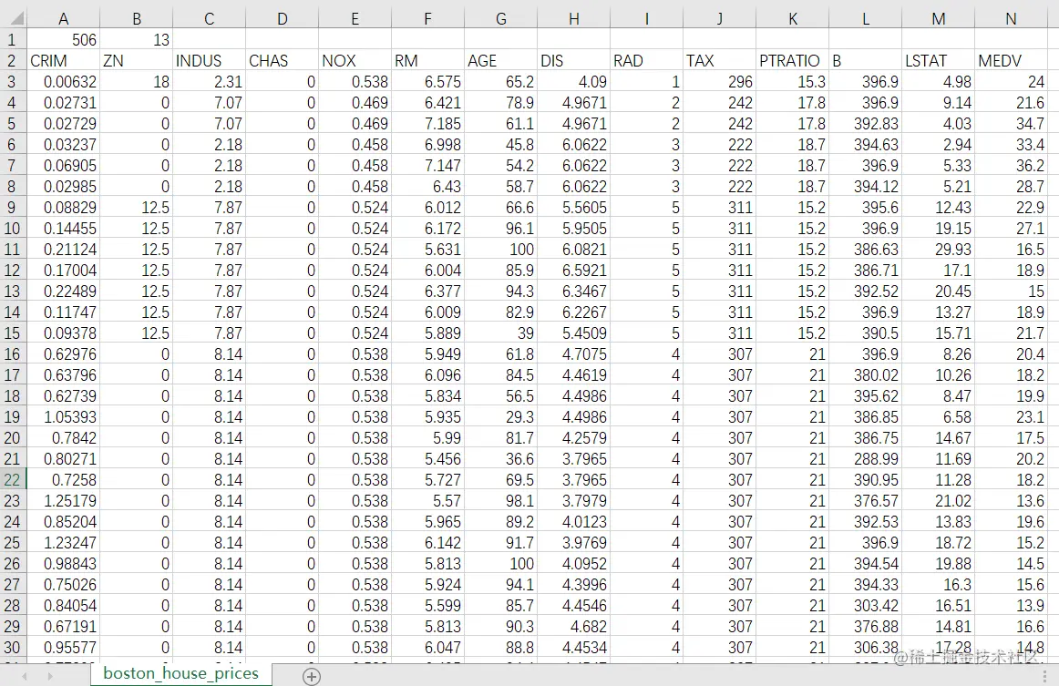 # 每条数据包括14项,其中前面13项是影响因素,第14项是相应的房屋价格中位数