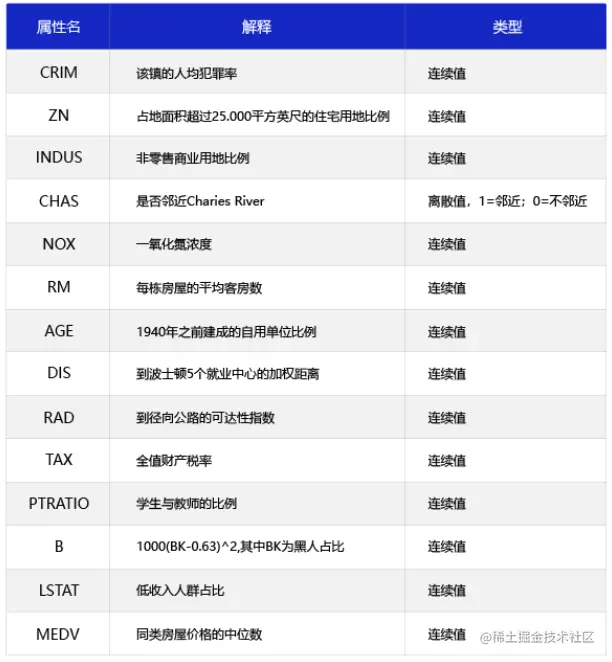 波士顿房价预测是一个经典的机器学习任务,类似于程序员世界的“Hello World”。和大家对房价的普遍认知相同,波士顿地区的房价受诸多因素影响。该数据集统计了13种可能影响房价的因素和该类型房屋的均价,期望构建一个基于13个因素进行房价预测的模型,如下图所示。