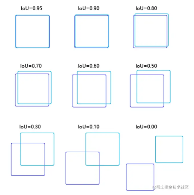 为了直观的展示交并比的大小跟重合程度之间的关系,下图示意了不同交并比下两个框之间的相对位置关系,从 IoU = 0.95 到 IoU = 0.