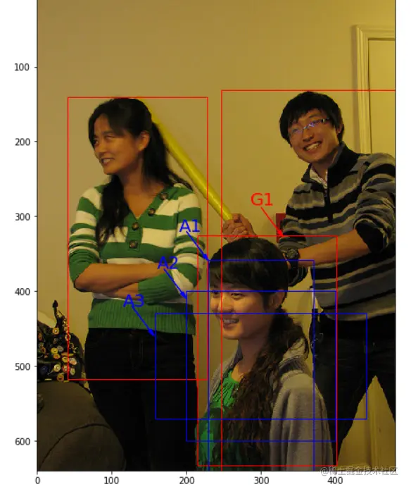 在下图中,以像素点[300, 500]为中心可以使用下面的程序生成3个框,如图中蓝色框所示,其中锚框A1跟人像区域非常接近。